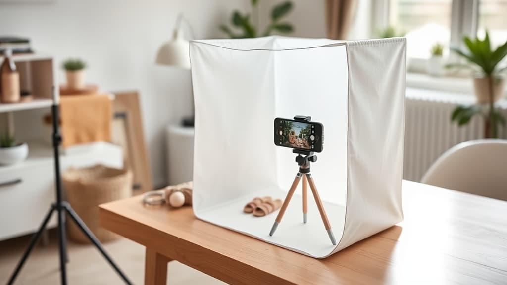 A lightbox is particularly useful for small, reflective, or detailed items — jewellery, electronics, cosmetics, and similar products. You can build one from a cardboard box, Christmas lights, and tracing paper for under £10. For larger products, a table-and-backdrop setup with window light or LED panels works better.
